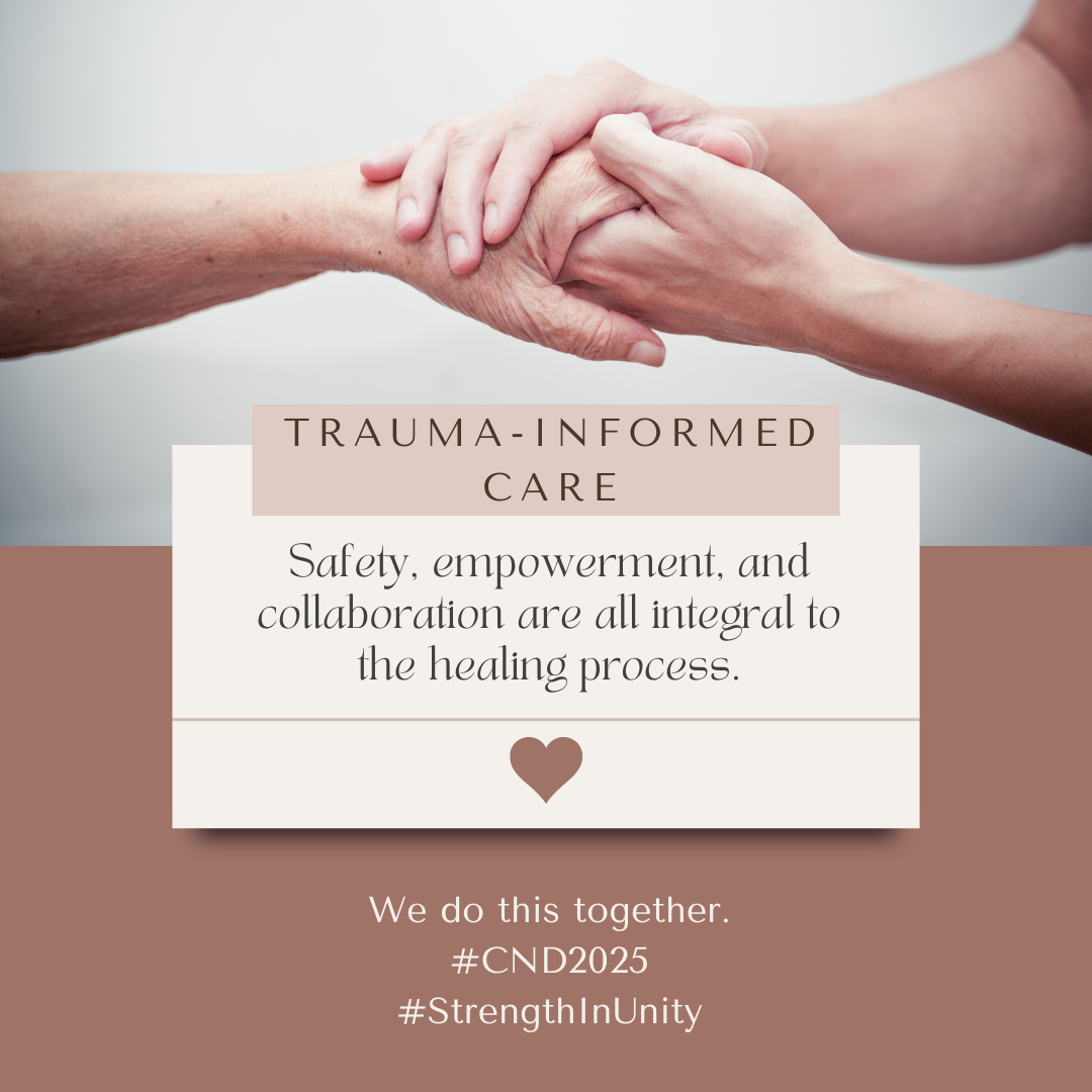 Trauma-informed care focuses on safety, empowerment, and collaboration in the healing process. By understanding the impact of trauma, it integrates support that avoids re-traumatization and fosters resilience. Together, we prioritize healing and growth. #CND2025 #StrengthInUnity